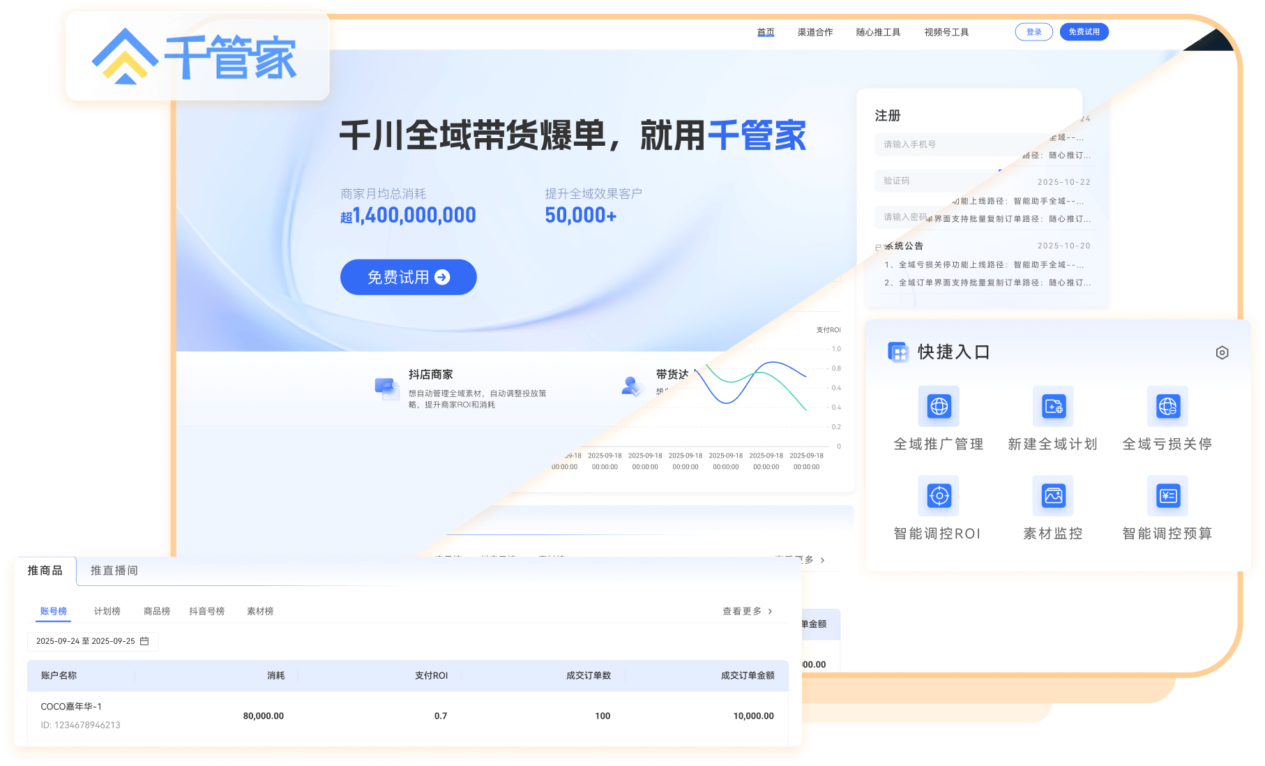 抖音电商广告排名第一的千川智能投放工具,服务千川商家数已超50000家,获得2000+头部品牌信赖